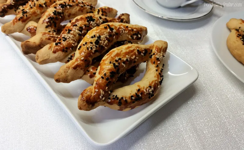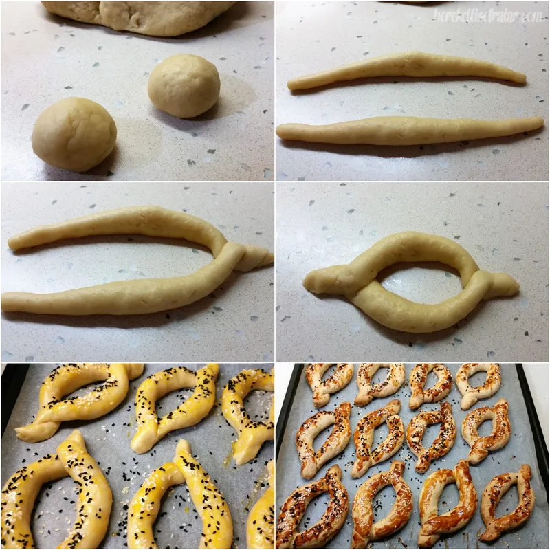 Malzemeler: 1 paket margarin 1 su bardağı sıvı yağ 1 su bardağı yoğurt 1 yumurta+1 yumurtanın beyazı 1 silme yemek kaşığı tuz 2,5 yemek kaşığı toz şeker 1 tatlı kaşığı mahlep Aldığı kadar un(yaklaşık 1 kg) (margarinin 50 gramını ayırıp onun yerine aynı miktarda tereyağı kullanabilirsiniz ) Üzeri için: 1 yumurta sarısı Yarım tatlı kaşığı yoğurt Yarım çay kaşığı toz şeker Çörek otu Susam Hazırlanışı: Çatal yapmak için önce margarini buzdolabından çıkarıp bekletin ve yumuşamasını sağlayın. Ben margarinin 50 gramını çıkarıp yerine tereyağı kullanıyorum. Sizde seviyorsanız tereyağı kullanabilirsiniz. Karıştırma kabına margarini alıp biraz yumuşayana kadar yoğurun. Margarinin üzerine sıvı yağ, yoğurt, 1 yumurta ve 1 yumurta beyazı, tuz ve toz şekeri ilave ederek iyice karıştırarak yoğurmaya devam edin. İyice karıştırdıktan sonra üzerine unu ilave edin. Unu yavaş yavaş ilave ederek hamuru yoğurmaya devam edin. Hamur kulak memesi kıvamından az daha katı ele yapışmayacak şekil verebileceğiniz bir kıvamda olsun. Yoğurduğunuz hamurdan ceviz kadar parçalar koparıp yuvarlayın. Aslında hamur parçalarının büyüklüğü biraz sizin isteğinize bağlı. Yani biraz daha büyük veya biraz daha küçük parçalar alabilirsiniz. Yaptığınız çatalın şeklide buna göre büyük ya da küçük olur. Yuvarladığınız hamuru tezgahın üzerinde elinizle yuvarlayıp rulo yapın. Rulo yaptığınız hamurun iki ucunu biraz daha inceltin. Yuvarladığınız bir hamuru daha alıp aynı şekilde bir tane daha hazırlayın. Sonra ikisini yanyana getirip ince uçlarını bir araya getirin elinizle birleştirin. Birleştirirken birbirinin altından geçirip sağlamlaştırın. Aynı şekilde diğer uçlarını da birleştirin. Şekil verdiğiniz çatal hamurunu yağlı kağıt serilmiş tepsiye alın. Yumurta sarısını yarım tatlı kaşığı yoğurt ve yarım çay kaşığı toz şeker ile karıştırın. Tepsiye aldığınız çatalın üzerine sürün. Çatalların üzerlerine susam ve çörek otu serpip önceden ısıtılmış 180 derece fırında üzeri kızarana kadar pişirin. Pişen çatalları ister sıcak isterseniz soğutarak servis edin. Afiyet olsun.