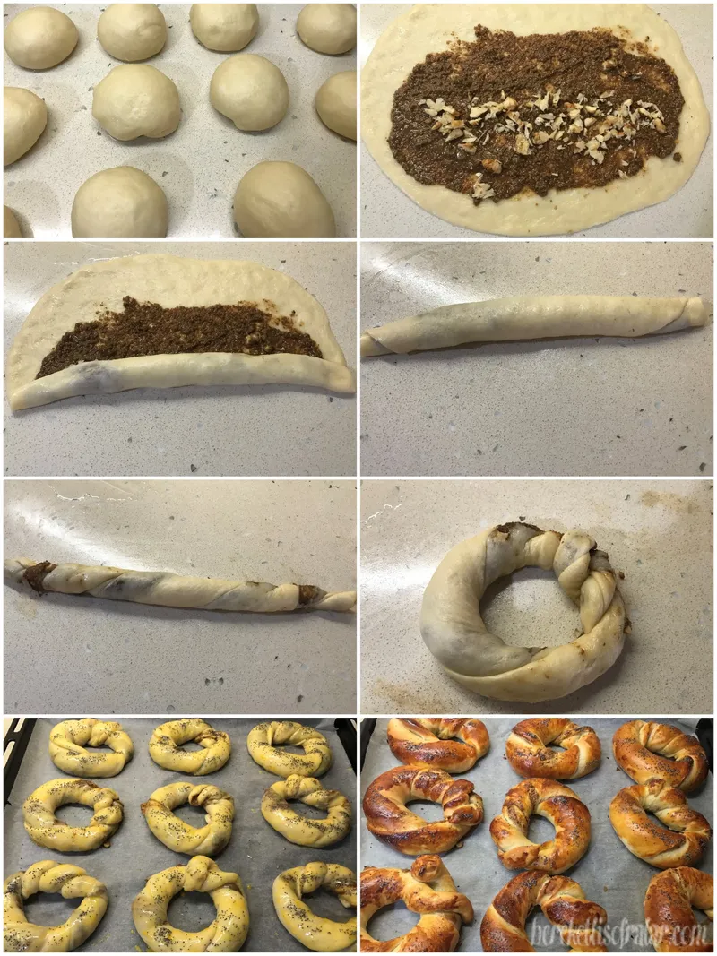 Malzemeler: 1 su bardağı ılık süt Yarım su bardağı sıvı yağ Yarım su bardağı ılık su 1 tam yumurta + 1 yumurtanın beyazı (sarısını üzerine kullandım) 1 silme tatlı kaşığı tuz 1,5 yemek kaşığı toz şeker Yarım paket yaş maya Aldığı kadar un İç Malzemesi: 1 su bardağı kadar haşhaş ezmesi 5-6 yemek kaşığı sıvı yağ Üzerine sürmek için: 1 yumurta sarısı Yarım çay kaşığı yoğurt Yarım çay kaşığı toz şeker Mavi haşhaş Hazırlanışı: El yakmayacak kadar ılık suyu karıştırma kabına alın ve içine yaş mayayı atıp ezin. Üzerine toz şekeri ekleyerek iyice karıştırın. Ilık süt, sıvı yağ, 1 yumurta + 1 yumurtanın beyazı ve tuzu ekleyip iyice karıştırın. Üzerine unu yavaş yavaş ilave edip yoğurun. Elinize yapışmayacak kulak memesinden yumuşak bir hamur oluncaya kadar unu ekleyip yoğurmaya devam edin. İyice yoğurduktan sonra hamurun üzerini hava almayacak şekilde kapatıp mayalanmaya bırakın. Hamur iki katına çıkana kadar bekleyin. Haşhaşın içine sıvı yağ ekleyerek bir kaşık yardımıyla karıştırın ve sürülebilecek bir kıvama getirin. Ceviz içini biraz iri parçalar olacak şekilde çekin. Hamur mayalanınca mandalina büyüklüğünde parçalar koparıp elinizle yuvarlayarak beze yapın. Tezgahın üzerini çok az yağlayıp hamur bezelerini buraya alın. Yağladığınız tezgahda hamuru elinizle pasta tabağı büyüklüğünde açın. Elinizi arada yağa sürerseniz daha kolay açarsınız. Sonra yağla açtığınız haşhaşı hamurun üzerine sürüp az ceviz serpin. Hamuru yuvarlayarak bir rulo haline getirin iki ucunu birbirinin tersi yönünde kıvırın. Bir halka oluşturacak şekilde uçları birleştirip birbirinin altından geçirip hamuru yapıştırın. Hazırladığınız açmaları yağlı kağıt serilmiş tepsiye alın. Yumurta sarısı, yoğurt ve toz şekeri karıştırıp açmaların üzerine sürün. Son olarak açmaların üzerine mavi haşhaşı serpip 15- 20 dakika tepside mayalandırın. Önceden ısıtılmış 180 derece fırında üzerleri kızarana kadar pişirin. Haşhaşlı açmalar kızarınca fırından çıkarıp sıcak sıcak servis edin. Afiyet olsun.