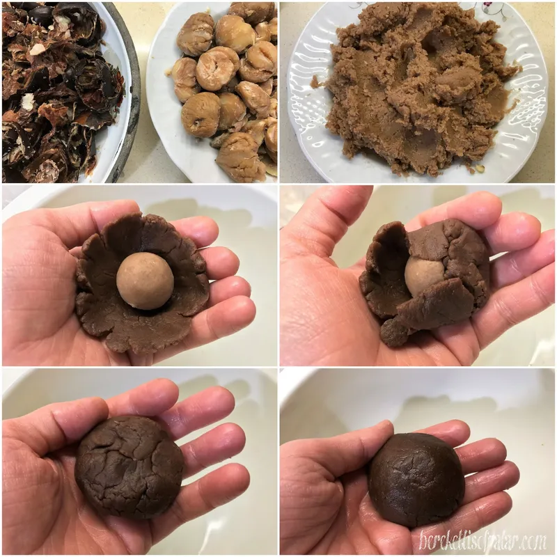 Hazırlanışı: Kestaneli kurabiye için önce kestaneli içi hazırlayarak başlayın. Kestaneleri yıkayıp bir bıçak yardımıyla çok derine inmeden üzerine çizikler atın. Orta büyüklükte bir tencereye önce kaynar suyu alıp toz şeker, tuz ilave edip ve üzerine yavaş yavaş kestaneleri ekleyin. Kestanelerin hepsini birden atarsanız kaynaması durur ve kestaneler güzel haşlanmaz. Yaklaşık 25-30 dakika orta ateşte kaynatın ve bir çatal yardımıyla kestanelerin pişip pişmediğini kontrol edin. Kestaneler pişince bir süzgece alıp suyunu süzün ve üzerine soğuk su dökün. Elinizi tutabilecek sıcaklığa gelince önce dışındaki kalın kabuğu sonrada iç kısmındaki zar gibi olan bölümü soyun. Kestaneleri soyarken parçalanabilir bu hiç önemli değil zaten içini hazırlarken parçalanacak. Bir cezveye ya da uygun bir kaba 1 su bardağı toz şeker ve 1 su bardağını alıp kaynatın. Kaynamaya başladıktan sonra yaklaşık 18-20 dakika kısık ateşte kaynatın ve oldukça katı kıvamlı bir şerbet elde edin. Bir kenarda soğumaya bırakın. Ayırıp hazırladığınız kestaneleri bir rondoya ya ada robota alıp parçalayın. Üzerine vanilya ve kakaoyu ilave edip karıştırın. En son olarak hazırlayıp soğuttuğunuz şerbeti yavaş yavaş ilave edin. Şekil verilecek bir kıvama gelinceye kadar ilave ederek robotta çekmeye devam edin. Bir karıştırma kabına oda sıcaklığında beklemiş tereyağı, yumurta, pudra şekerini alıp iyice karıştırın. Sonra üzerine 1-2 su bardağı un, kakao ve vanilyayı ilave edip yoğurmaya devam edin. Sonra elinizde yapışmayacak bir kıvama gelinceye kadar un ilave etmeye devam edin. Hamurun kıvamı şekil verilebilecek kıvamda olsun. Bunun için unu kontrollü ekleyin. Hazırladığınız hamurdan ceviz büyüklüğünde parçalar alıp elinizde yuvarlayın. İçini elinizde açarak kestane ezmesinden içine sığacak büyüklüğünde parçalar alıp kurabiyenin içine yerleştirin. İsterseniz kestane ezmesinden kurabiyenin içine sığacak büyüklükte parçalar alıp yuvarlayıp hazırlayın ve kurabiyenin içine yerleştirin. Elinizle yavaş yavaş hamuru kapatıp yuvarlayın ve hafifçe iki avcunuzun ortasında bastırarak biraz yassıltın. Yağlı kağıt serilmiş tepsiye alıp önceden ısıtılmış 170 derece fırında 20 dakika kadar kızartın. Kurabiyelerin pişip pişmediğini kontrol edip fırından çıkarın ve soğumaya bırakın. Bitter çikolatayı küçük parçalara ayırın. Bir kasenin içine alın ve kaynar su dolu bir kabın üzerine yerleştirin. Çikolatayı benmari usulü eritip içine tereyağını ekleyin. İyice karıştırın ve soğuyan kurabiyelerin üst kısmını çikolataya batırıp alın. Çikolatalar donuncaya kadar bekletip servis edin. Afiyet olsun.