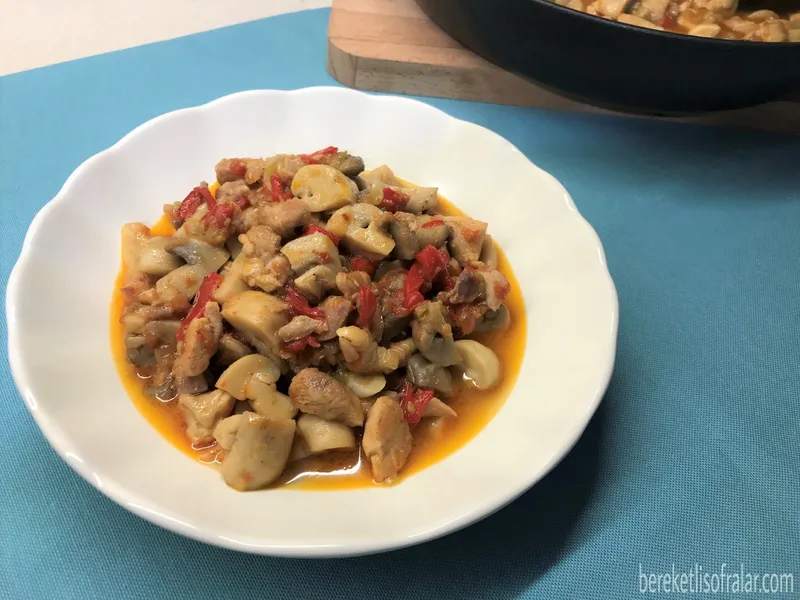 Mantarlı tavuk sote oldukça kolay ve lezzetli bir yemek. Yanında makarna, pirinç ya da bulgur pilavı ile servis edebilirsiniz. Tek yemek çeşidi benim için yeterli derseniz güzel bir yeşil salata ya da yoğurtla servis edebilirsiniz. Tavuk ve mantar pişince sebzeleri ekleyin ve kullandığınız sebzeleri çok öldürmemeye çalışın. Kullandığınız sebzeler istediğiniz kadar sulanmazsa en son domatesi ekleyip birkaç dakika kısık ateşte kaynattıktan sonra az su ilave edebilirsiniz. Domates mevsimi geçtiği için yemeğinizin rengi az gelirse domates salçası ilave edebilirsiniz. Şimdiden afiyet olsun. Malzemeler: 600-700 gram kemiksiz tavuk eti (but ve göğüs eti karışık) 400 gram mantar 5-6 yemek kaşığı sıvı yağ Yarım yemek kaşığı tereyağı 1 orta boy kuru soğan 1 büyük kırmızı biber 3 büyük çarliston biber 2 büyük domates 3-4 iri diş sarımsak Hazırlanışı: Mantarlı tavuk sote için önce tavuk etlerini kuşbaşı doğrayıp yıkayın ve süzülmeye bırakın. Mantarları yıkayıp küçükse dörde büyükse daha fazla parçaya ayırarak doğrayın. Kırmızı ve çarliston biberi yıkayıp çekirdeklerini ayırın ve doğrayın. Soğan ve sarımsağı soyup yıkayın ve küçük küçük doğrayın. Domatesleri yıkayıp kabuklarını soyun ve küçük parçalar halinde doğrayın. Tavayı ocağın üzerine alıp kızdırın ve sıvı yağı alıp üzerine tavuk etlerini ekleyin. Etler hafif renk alıncaya kadar pişirin. Sonra üzerine tereyağı ve soğanları ekleyin. Üzerine mantarı ilave edip kavurmaya devam edin. Sonra sırasıyla kırmızı biberi ekleyip 1-2 dakika kavurup çarliston biberi ilave edin. Biraz daha karıştırıp sarımsakları ilave edin. Tuz, pul biber ve karabiberi ekleyip en son domatesleri ekleyin. Kaynamaya başlayınca tavanın kapağını kapatın ve ocağı kısıp 5-6 dakika kadar kaynatın. Mantarlı tavuk soteyi kontrol edip pişmişse ocağı kapatıp sıcak sıcak servis edin. Afiyet olsun.