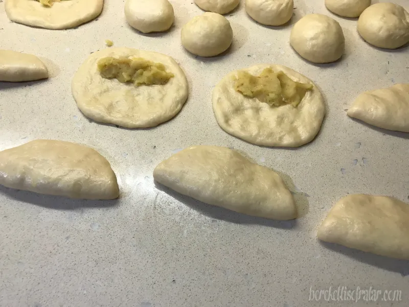 Hazırlanışı: Patatesli poğaça için önce patatesleri haşlayıp ezin. Kuru soğanı küçük küçük doğrayın. Tavaya sıvıyağ ve tereyağını alıp üzerine doğradığınız soğanları ekleyin. Pembeleşinceye kadar karıştırarak kavurup haşlayıp ezdiğiniz patatesleri ilave edin 4-5 dakika karıştırarak kavurun. Pul biber, karabiber ve tuzu ilave ederek karıştırın. Patatesi kavurduktan sonra soğumaya bırakın. Mayayı bir kaseye alıp parçalayın ve üzerine el yakmayacak kadar az ılıtılmış suyu ekleyin ve iyice karıştırın. Büyükçe bir karıştırma kabına sıvı yağı alın. Sütü çok az ılıtıp ilave edin. İçine toz şekeri ve tuzu atıp eritin. Suyun içinde erittiğiniz mayayı da ilave edin. Sonra iki yumurtanın beyazı ve bir bütün yumurtayı ekleyin. Bütün sıvı malzemeleri bir çırpma teliyle ya da çatalla iyice karıştırın. Sonra içine unu yavaş yavaş ilave edip çırpma teliyle karıştırmaya devam edin. Katılaşmaya başlayınca elinizle yoğurmaya başlayın. Ölçüsü verilen unu yavaş yavaş ilave edip yoğurun. Oldukça yumuşak az ele yapışan bir hamur oluyor. Hamurun ağzını kapatıp bir kenarda en az iki katı oluncaya kadar mayalanmaya bırakın. Mayalanan hamurdan mandalinadan küçük parçalar koparıp yuvarlayın. Tezgahın üzerinde elinizle düzeltip yuvarlak bir şekil verin ve bir tarafına hazırladığınız patatesli harcı yerleştirin. Boş kalan kısmını dolu kısmının üzerine kapatıp kenarlarına hafifçe bastırıp yağlı kağıt serilmiş ya da yağlanmış fırın tepsisine alın. Üzeri için verilen malzemeleri bir kasede karıştırıp patatesli poğaçaların üzerine sürün. Tepside mayalanması için on beş dakika kadar bekletin. Önceden ısıtılmış 180-200 derece fırında üstü altı güzelce kızarana kadar pişirin. Patatesli poğaça fırından çıkarınca 5-10 dakika bekletip sıcak sıcak servis edin. Afiyet olsun.