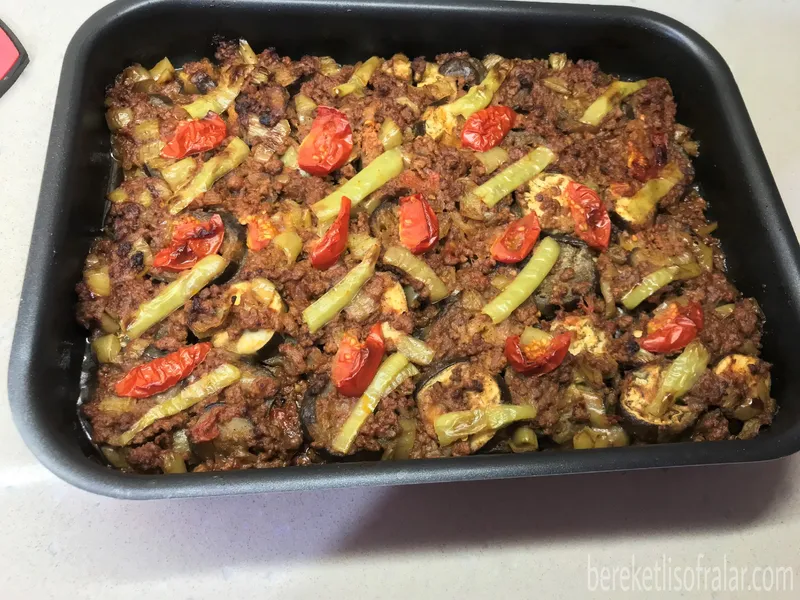 Malzemeler: 5-6 tane büyük patlıcan 350-400 gram kıyma 8 tane çarliston biber 3 orta boy domates 1,5 yemek kaşığı domates salçası 1 çay bardağı sıvı yağ 1 yemek kaşığı tereyağı Pul biber Karabiber Kaya tuzu Hazırlanışı: Soğanları küçük küçük doğrayın. Çarliston biberleri yıkayıp çekirdeklerini çıkarın ve küçük küçük doğrayın. Domatesleri yıkayıp kabuklarını soyup doğrayın. Domates ve biberlerden üzeri için birer tane ayırın. Tavaya yağları alıp üzerine soğanı ekleyin ve az kavurun. Üzerine kıymayı ekleyip karıştırarak kavurun. Kıyma kavrulunca üzerine salçayı ekleyip biraz daha kavurun. Çarliston biberleri ekleyip birkaç dakika daha kavurup domatesi ekleyin. Pul biber karabiber ve tuzu ilave edip karıştırın ve ocağı kapatın. Patlıcanı yıkayıp çizgili soyun. Üzerine tuz serpip biraz bekleterek acısını çıkarın. Sonra yıkayıp bir santim kalınlığında yuvarlak dilimleyin. Tepsiye patlıcanların yarısını dizip üzerine kıymalı harcın yarısını yayın. Kalan patlıcanı ikinci kat üzerine dizip kıymalı harcı üzerine yayın. Yarım su bardağı suyu tepsinin üzerine dökün. Ayırdığınız domates ve çarliston biberi dilimleyip tepsinin üzerine dizin yağlı kağıtla kapatıp önceden 200 derecede ısıtılmış fırında 20-25 dakika pişirin. Sonra açıp pişip pişmediğini kontrol edin. Patlıcan oturtma pişince üzerini açıp 4-5 dakika kızartın. Fırından çıkarıp az dinlendirin ve sıcak sıcak servis edin. Afiyet olsun.