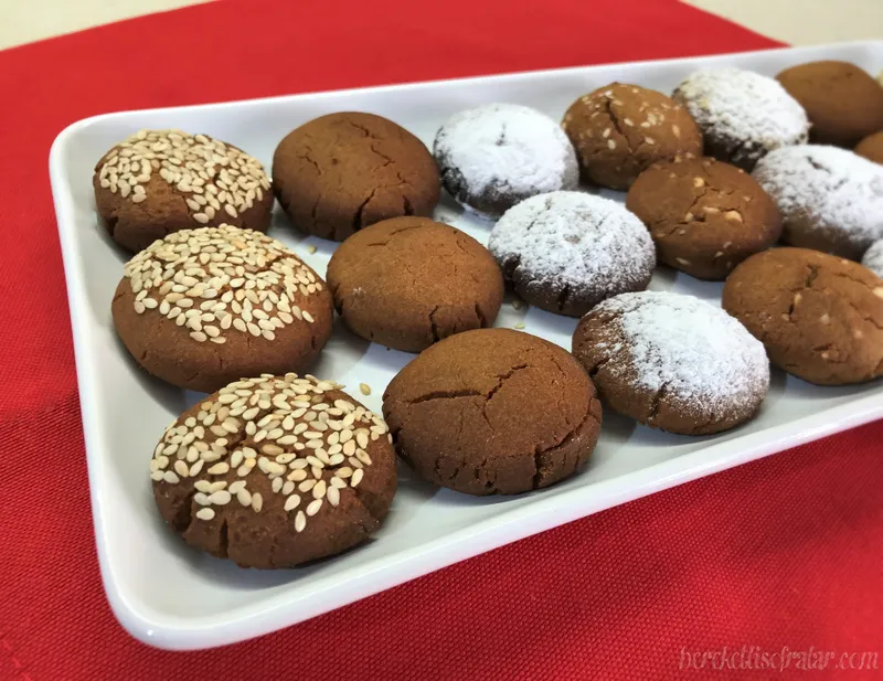 Tahinli pekmezli kurabiye şeker kullanılmadan yapılan bir kurabiye çeşidi. Şekerli tadı ise içine kullanılan pekmezden alıyor. Dut pekmeziyle de denedim ama üzüm pekmeziyle daha güzel bir lezzeti oldu. Bir çeşit hamur hazırlayıp birkaç çeşit yapmayı seviyorum. Tahinli pekmezli kurabiye hamurunu hazırlayınca da aynı şekilde birkaç çeşit yaptım. Hamurun birazını sade kurabiye hazırladım. Kalan kısmını ise ikiye bölüp yarısına daha önce yaptığım tatlılar için hazırladığım fındık ceviz kırığından ekleyip karıştırdım ve şekil verim. Diğer hamur parçasını ise şekil verdikten sonra susama batırdım. Ama siz tamamını susamlı yapmak isterseniz yumurtanın sarısını içine beyazını dışına sürüp susama batırın. Böylelikle susamlar kurabiyeye yapışıp çabuk dökülmez. Aynı şekilde kırılmış yumurta beyazını kurabiyenin yüzüne sürerek fındık kırığına da batırabilirsiniz. Şekeri sizin için yeterli değilse ya da görünümü daha güzel olsun isterseniz piştikten sonra pudra şekeri eleyebilirsiniz. Tahinli pekmezli kurabiye hazırlaması kolay ve oldukça lezzetli bir kurabiye. Çay sofralarınız içinde farklı bir ikram çeşidi. Şimdiden afiyet olsun. Malzemeler: 1 çay bardağı tahin 1 çay bardağı üzüm pekmezi 125 gr tereyağı ya da margarin (oda sıcaklığında yumuşamış) 1 yumurta 3 su bardağı+1 yemek kaşığı un Yarım paket kabartma tozu Yarım paket vanilya İsterseniz üzerine pudra şekeri, susam, kırılmış fındık ya da ceviz ilave edbilirsiniz Hazırlanışı: Tereyağını karıştırma kabına alıp yumurtayı içine kırın. İyice karıştırıp tahin ve pekmezi ekleyin. Bütün malzemeyi iyice birbirine karışıncaya kadar bir çırpıcı ya da elinizle karıştırın. Üzerine un, kabartma tozu ve vanilyayı ekleyerek yoğurmaya başlayın. Unu yavaş yavaş ekleyip şekil alabilecek kıvama gelinceye kadar ilave edin. Ben 3 su bardağı+1 yemek kaşığı kullandım ama siz yavaş yavaş ekleyip elinizde şekil alacak kıvama gelince un eklemeyi bırakın. Elinize hamurdan cevizden küçük parçalar koparıp yuvarlayın ve sonra hafifçe iki avcunuzun içiyle hafifçe bastırıp yağlı kağıt serilmiş ya da yağlanmış tepsiye dizin. Önceden ısıtılmış 170 derece fırında yaklaşık 15-20 dakika pişirin. Tahinli pekmezli kurabiye pişince fırından çıkarıp soğumaya bırakın. Kurabiyeler soğuyunca servis edebilirsiniz. Afiyet olsun.