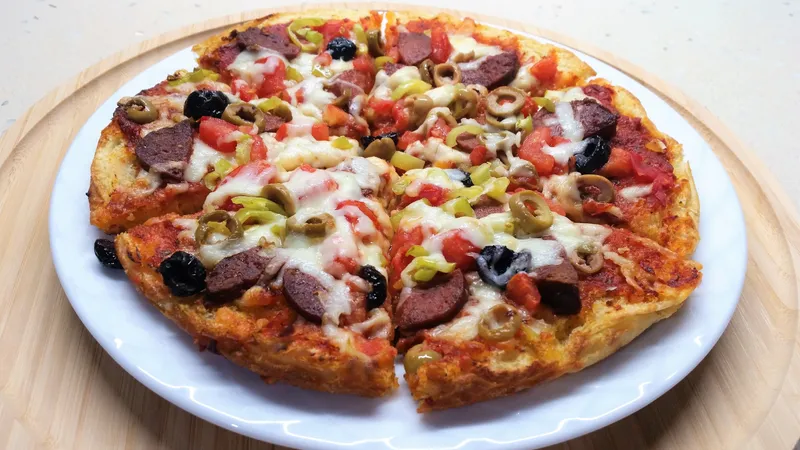 Bazlama Pizza Malzemeler: 1 tane bazlama Taze kaşar Sucuk 1 tane domates 2 tane çarliston biber Çekirdeksiz yeşil ve siyah zeytin Sos Malzemesi: 1 dolu yemek kaşığı domates salçası 2 yemek kaşığı zeytinyağı 1 dolu çay kaşığı kuru kekik Yarım çay kaşığı toz şeker Pul biber Karabiber Su Hazırlanışı: Bazlama pizza için önce bazlamayı enine ikiye ayırın ve iç kısmı üste gelecek şekilde tepsiye alın. Salça, zeytinyağı, pul biber, karabiber, kekik, toz şeker ve suyu karıştırıp bazlamaya sürülebilecek bir sos kıvamına getirin. Su ölçüsünü sos istediğiniz kıvama gelecek şekilde ayarlayın. Sucuğu dilimleyin. Domatesi yıkayıp küçük küçük doğrayın. Biberleri yıkayıp çekirdeklerini ayırın ve küçük küçük doğrayın. Zeytinlerin çekirdeklerini ayıklayın ya da hazır ayıklanmış dilimli zeytin kullanın. Kaşar peyniri rendeleyin. Hazırlanan sosu bazlamanın üzerine sürün. Taze kaşarı bazlamanın üzerine serpin. Sonra dilimleyip hazırladığınız sucuk, domates, çarliston biber, yeşil ve siyah zeytini bazlamanın üzerine serpin. 180-200 derece önceden ısıtılmış fırında pişirin. Üzerindeki kaşar eriyip sebze ve sucuklar az pişene kadar yaklaşık 8-10 dakika kadar kızartın. Fırınınızın pişirme süresi değişebilir ve daha az sürede kızarabilir. Siz kendi fırınınıza göre süresini ayarlayın. Çok fazla kızartıp kurutmamaya dikkat edin. Pizza kızarınca çıkarıp üzerine az daha kaşar rendeleyin ve eriyene kadar fırına verin. Sonra çıkarıp dilimleyerek sıcak sıcak servis edin. Afiyet olsun.