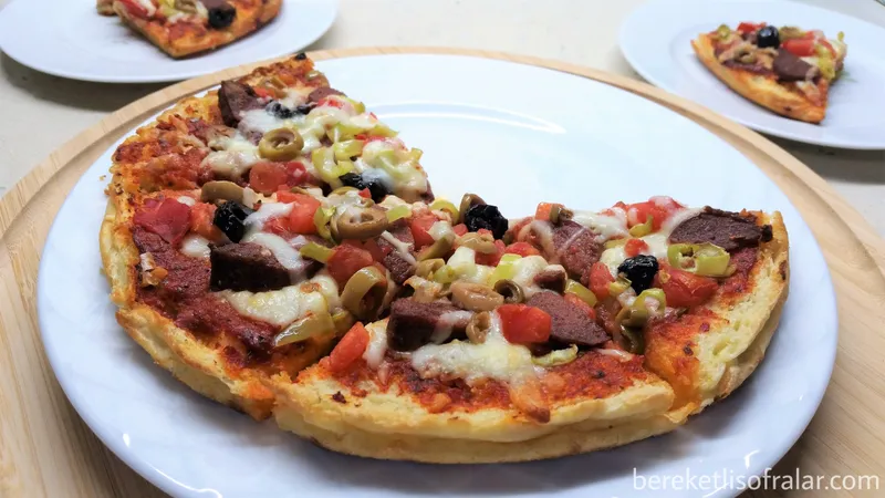 Bazlama pizza tarifinin videosu için bereketli sofralar youtube kanalını ziyaret edebilirsiniz. Videoyu beğenmeyi ve kanala abone olmayı unutmayın. Canınız kolay ve lezzetli bir şeyler hazırlamak isterse bazlama pizza size göre bir tarif. O kadar kolay hazırlanıyor ki sonuçta ortaya çıkan lezzet sizi şaşırtacak. Bu tarifi nette ilk gördüğümde kolay bir tarif diye denemek istedim ama sonucun bu kadar lezzetli olacağını düşünmemiştim. Yani neredeyse bu pizzayı bazlamadan yaptığınızı söylemeseniz kimse anlamaz. Pizzanın üstünde istediğiniz malzemeleri kullanabilirsiniz. Üzeri için kullandığım sosu siz damak tadınıza göre değiştirebilirsiniz. Salça yerine domates sosu kullanabilirsiniz. Ben daha önce domates sosuyla denedim ve öylede çok lezzetli oldu. Sosun içinde az toz şeker kullandım. Domates salçasını sade kullanınca biraz ekşimsi olabiliyor. İçine toz şekeri ekleyince daha lezzetli oldu ama isterseniz kullanmayın. Bazlama pizza tarifini mutlaka deneyin. Şimdiden afiyet olsun.