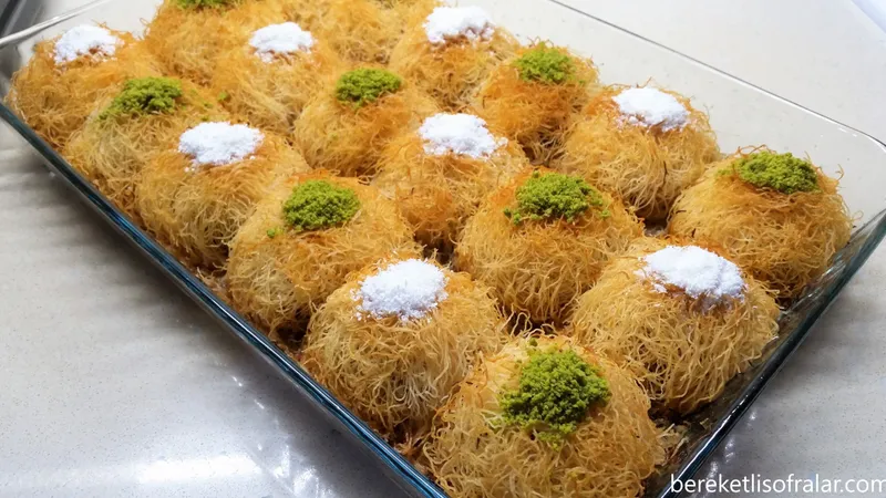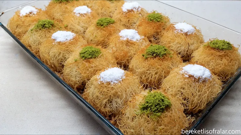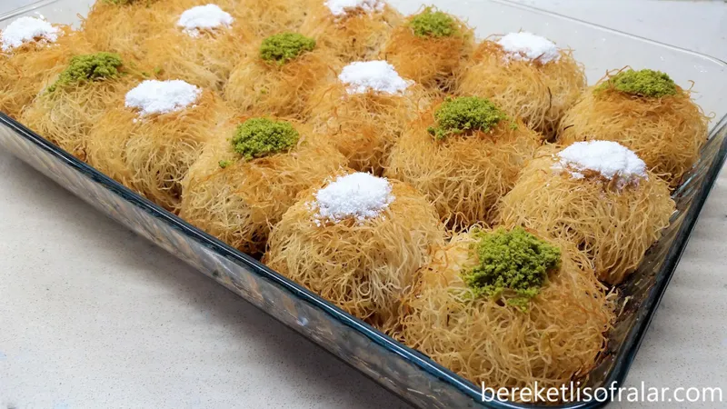 Hazırlanışı: Uygun büyüklükte bir tencereye şeker, süt ve suyu alıp karıştırın ve kaynamaya bırakın. Bu aşamada ocağın yanından ayrılmayın çünkü şerbette süt olduğu için çabuk taşabilir. Kaynamaya başlayınca ocağı en kısığa alıp 10 dakika kadar kaynatın ve soğumaya bırakın. Şerbetin ılınması ya da oda sıcaklığında olması yeterli. Tereyağını bir tavaya alıp eritin. Üzerine sıvı yağı ekleyip kenara alın ve ılınmaya bırakın. Kadayıfları bir tepsiye dökün. Elinizle didikleyerek yapışanları tamamen ayırın. Üzerine eritip hazırladığınız yağı döküp elinizle kadayıfın her tarafına bulanana kadar karıştırın. Büyük kahve ya da çay fincanını alın ve içine kadayıfı yerleştirin. Kadayıfı fincanı dolduracak miktarda ayarlamaya çalışın. İlk denemeyi boş yaparak miktarını ayarlayabilirisiniz. Kadayıfı uzun şekilde fincandan dışarı sarkacak biçimde fincana yayın. Fincanın altınında da kadayıf olmasına dikkat edin. Ortasını ceviz içi ile doldurup yanlardan sarkan kadayıfları fincanın içinde toplayın. Elinizle bastırınki çevirirken hemen dağılmasın. Sonra tepsiye ters çevirin. Kadayıf bitene kadar aynı şekilde devam edin. Önceden 180 derece ısıtılmış fırına alın. İlk başta 10 dakika bu ayarda sonra 160 dereceye düşürüp içini çekip üzeri kızarana kadar pişirin. Fırından çıkan kadayıfı 5-6 dakika bekletin ve soğuyan şerbeti üzerine dökün. Eğer kadayıf yumuşacık olsun isterseniz üzerine bir tepsi örtün. Daha kıtır kıtır kalsın derseniz tepsi örtmeyin. Şerbeti iyice çekip soğuyunca üzerine antep fıstığı ya da hindistan cevizi ile süsleyerek servis edin. Afiyet olsun.