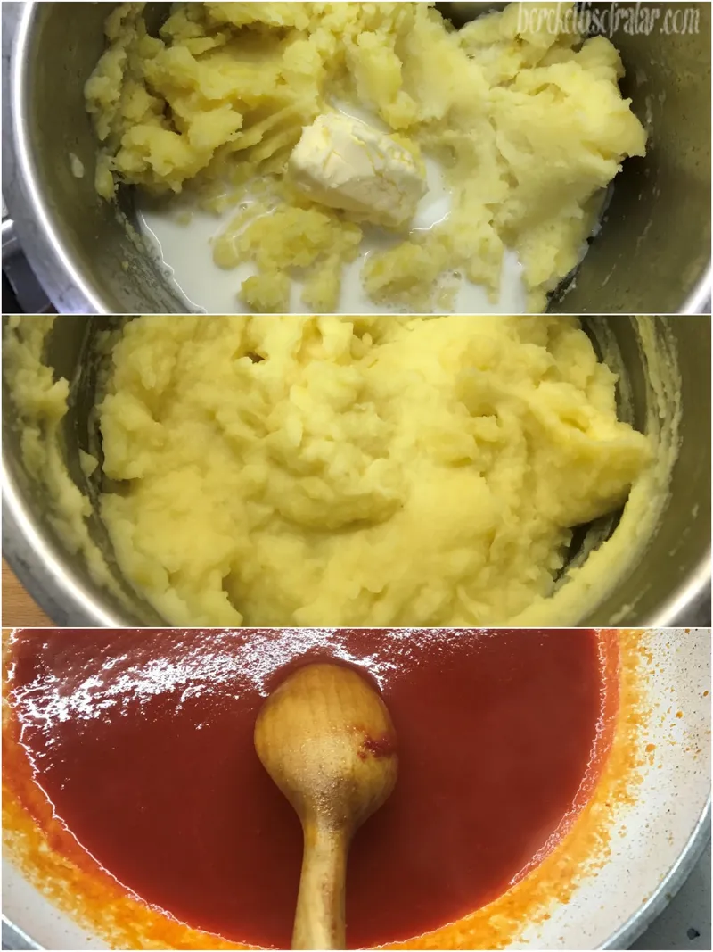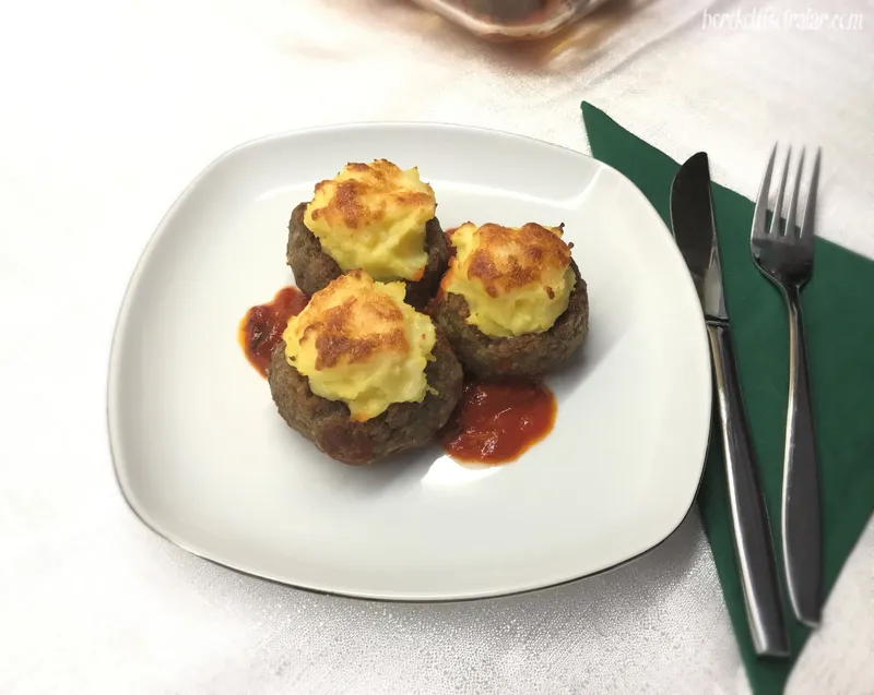 Malzemeler: 450-500 gr kıyma (az yağlı) 1 yumurta 1 orta boy soğan 1 iri diş sarımsak 2 dilim bayat ekmek Karabiber Pul biber Kimyon Kaya tuzu Yarım su bardağı kadar rendelenmiş kaşar peyniri Püre Malzemesi: 3 tane orta boy patates 1,5 çay bardağı süt 1 yemek kaşığı tereyağı Sos Malzemesi: 1 tepeleme yemek kaşığı salça 1 yemek kaşığı sıvı yağ 1,5 su bardağı su Hazırlanışı: Patatesleri haşlayıp suyunu süzün ve ezin. Ocağın üzerine alıp tereyağı ve sütü yavaş yavaş ilave edip orta ateşte karıştırın. Patatesi haşlarken tuz eklemediyseniz bu arada ilave edin. İstediğiniz kıvama gelmediyse süt ölçüsünü çok az daha artırabilirsiniz. Kuru soğanı çok küçük doğrayın ya da rendeleyin ve suyunu elinizde sıkıp karıştırma kabına alın. Bayat ekmekleri robotta veya rondoda çekin. Sarımsağı rendeleyin. Karıştırma kabına kıyma, yumurta, çekilmiş bayat ekmek, rendelenmiş sarımsak, doğrayıp suyunu sıktığınız soğanı alın. Üzerine karabiber, pul biber, kimyon, tuzu ilave edip iyice yoğurun. Eğer kıymanız tamamen yağsızsa yoğururken içine 1 veya 2 yemek kaşığı sıvıyağ ekleyebilirsiniz. İyice yoğurduğunuz köfte harcını vaktiniz varsa buzdolabında dinlenmeye bırakabilirsiniz ya da hemen yapabilirsiniz. Hazırladığınız köftelerden mandalinadan büyük parçalar alıp elinizde yuvarlayın. Sonra parmaklarınızın yardımıyla bir çanak şekli verip yağlanmış fırın tepsisine yerleştirin. Önceden ısıtılmış 190-200 derece fırında köfteler az kızarana kadar pişirin. Köfteleri çok kızartmayın yoksa çok kuru köfteler olur. Köfteler kızarırken sıvı yağ ve salçayı bir tavaya alıp biraz kavurun. Üzerine suyu ilave edip kaynayınca ocağı söndürün. Kızaran köfteleri fırından çıkarın ve ortalarına hazırladığınız patates püresini bir tatlı kaşığı yardımıyla yerleştirin. Pürelerin üzerine rendelenmiş kaşar peynirini yerleştirin. Köftelerin kenarından hazırladığınız salçalı sosu tepsiye ekleyin. Tepsiyi tekrar fırına alıp kaşarların üzeri az kızarana kadar bekletin. Sonra fırından çıkarıp sıcak sıcak servis edin. Afiyet olsun.