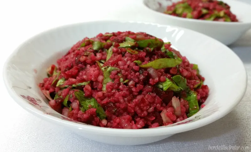 Uzun bir aradan sonra nihayet bir tarif paylaşabiliyorum. Bu arayı vermeme sebep olan neredeyse çevremdeki herkesi sırayla ziyaret eden soğuk algınlığı benide es geçmedi. İşin kötü tarafı bir aya yaklaştı ve hala toparlanamadım. Neyse bu konuyu bırakıp tarifimize geçelim. Bugün paylaştığım tarif lezzetiyle damağa rengiyle göze hitap ederek sofralarımızı şenlendiren pancarlı bulgur salatası tarifi. Benim gibi salata seviyorsanız bir kere denemenizi tavsiye ederim. Şimdiden afiyet olsun. Malzemeler: 1 su bardağı köftelik bulgur 1 kase pancar turşusu 1 küçük kuru soğan 3-4 yemek kaşığı zeytinyağı 2-3 yemek kaşığı nar ekşisi 6-7 dal kıvırcık 3-4 tane kornişon turşusu Pul biber Karabiber Kaya tuzu Hazırlanışı: Pancarlı bulgur salatası için önce bulguru hazırlayın. Bulguru seçip isterseniz yıkayın yada yıkamadan kullanın tercih sizin. Hazırladığınız bulguru küçük bir tencereye alın ve içine aynı ölçüde kaynar su ilave edin. Ocağı yakın kaynatın ve bulgur kaynayınca hemen kapatıp bulgurun suyu çekmesini bekleyin. Pancar turşularını çok küçük parçalar halinde doğrayın. Kornişon turşuyu küçük küçük doğrayın. Kuru soğanı soyup yıkayın ve küçük küçük doğrayın. Kıvırcıkları yıkayın ve incecik doğrayın. Salatayı karıştıracağınız kaba suyunu çeken ve soğuyan bulguru alın. Üzerine doğradığınız pancar turşularını alın ve elinizle iyice karıştırın. Sonra üzerine kuru soğanı ekleyip biraz daha karıştırın. Kornişon turşusu, kıvırcık, pul biber, karabiber ve tuzu ilave edip bir kaşık yardımıyla karıştırın. Üzerine zeytinyağı ve nar ekşisini ekleyip iyice karıştırın. Salatanın tadını kontrol ederek damak tadınıza göre tuz, baharat ve ekşisini ayarlayın ve servis kabına alın. Afiyet olsun.