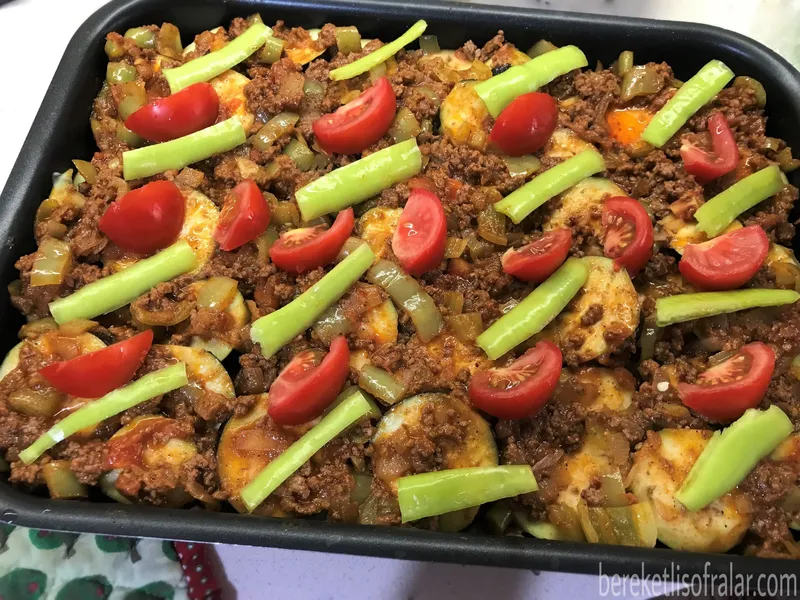 Malzemeler: 5-6 tane büyük patlıcan 350-400 gram kıyma 8 tane çarliston biber 3 orta boy domates 1,5 yemek kaşığı domates salçası 1 çay bardağı sıvı yağ 1 yemek kaşığı tereyağı Pul biber Karabiber Kaya tuzu Hazırlanışı: Soğanları küçük küçük doğrayın. Çarliston biberleri yıkayıp çekirdeklerini çıkarın ve küçük küçük doğrayın. Domatesleri yıkayıp kabuklarını soyup doğrayın. Domates ve biberlerden üzeri için birer tane ayırın. Tavaya yağları alıp üzerine soğanı ekleyin ve az kavurun. Üzerine kıymayı ekleyip karıştırarak kavurun. Kıyma kavrulunca üzerine salçayı ekleyip biraz daha kavurun. Çarliston biberleri ekleyip birkaç dakika daha kavurup domatesi ekleyin. Pul biber karabiber ve tuzu ilave edip karıştırın ve ocağı kapatın. Patlıcanı yıkayıp çizgili soyun. Üzerine tuz serpip biraz bekleterek acısını çıkarın. Sonra yıkayıp bir santim kalınlığında yuvarlak dilimleyin. Tepsiye patlıcanların yarısını dizip üzerine kıymalı harcın yarısını yayın. Kalan patlıcanı ikinci kat üzerine dizip kıymalı harcı üzerine yayın. Yarım su bardağı suyu tepsinin üzerine dökün. Ayırdığınız domates ve çarliston biberi dilimleyip tepsinin üzerine dizin yağlı kağıtla kapatıp önceden 200 derecede ısıtılmış fırında 20-25 dakika pişirin. Sonra açıp pişip pişmediğini kontrol edin. Patlıcan oturtma pişince üzerini açıp 4-5 dakika kızartın. Fırından çıkarıp az dinlendirin ve sıcak sıcak servis edin. Afiyet olsun.
